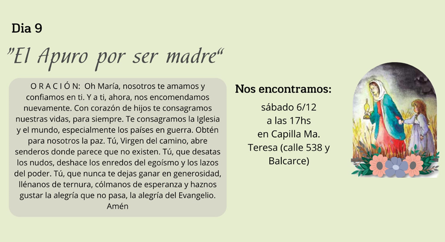 En el Centro Madre Teresa (calle 538 y Balcarce) será el último escalón de esta escalerita que es la novena a la Inmaculada… Hoy nos regocijaremos en tu ternura de madre, María… Danos esos sentimientos.
