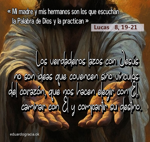 Jesús no se distancia de su familia, sino que la presenta como ejemplo de la verdadera escucha que cambia actitudes y comportamientos. Así enseña que los verdaderos lazos con Él no se reducen a ideas que convencen o a leyes que se cumplen, sino que son vínculos del corazón, que nos hacen elegir con Él, caminar con Él y compartir su destino.