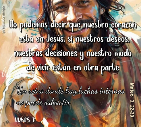 Este texto tiene una fuerza profética muy actual: muchas veces llamamos bien al mal y mal al bien. Y como un reino dividido no puede subsistir, tampoco puede hacerlo una vida dividida. No se puede servir a dos reinos al mismo tiempo. No podemos decir que seguimos a Jesús si nuestro corazón está en Él, pero nuestras decisiones, nuestros deseos y nuestro modo de vivir están en otra parte.