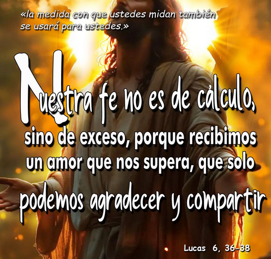 “Con la medida con que midan, serán medidos”. La medida de Dios es desbordante. Él no da en pequeñas dosis. Por eso la fe cristiana no es una religión del cálculo, sino del exceso de amor. Recibimos un amor que nos supera, que no podemos controlar ni administrar a nuestro antojo. Solo podemos acogerlo con gratitud y dejar que pase a través de nosotros hacia los demás.